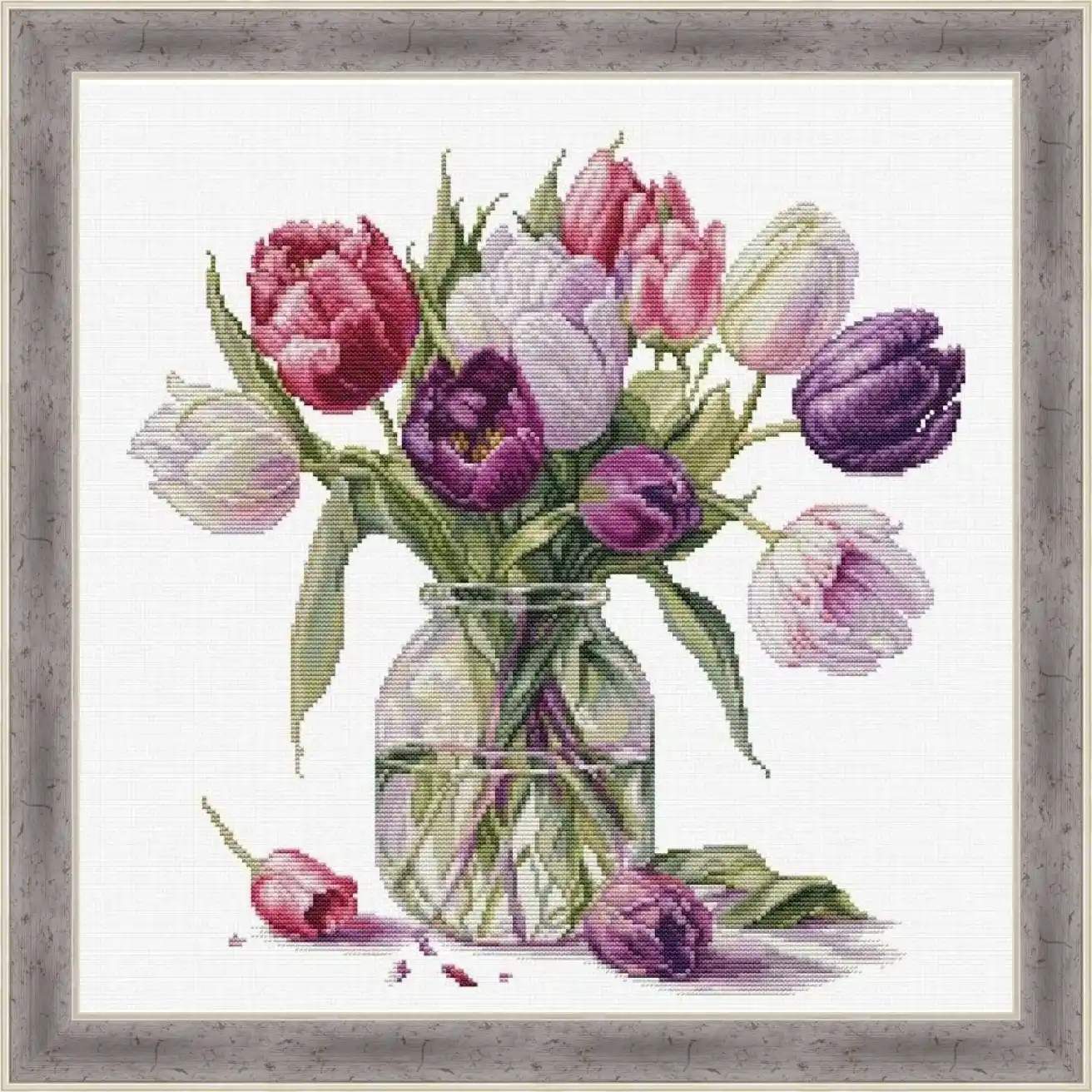 A refined floral cross stitch pattern featuring a delicate bouquet of tulips arranged in a transparent glass vase. Soft pastel shades, gentle color transitions, and an airy composition create a calm, elegant design inspired by spring light and freshness.