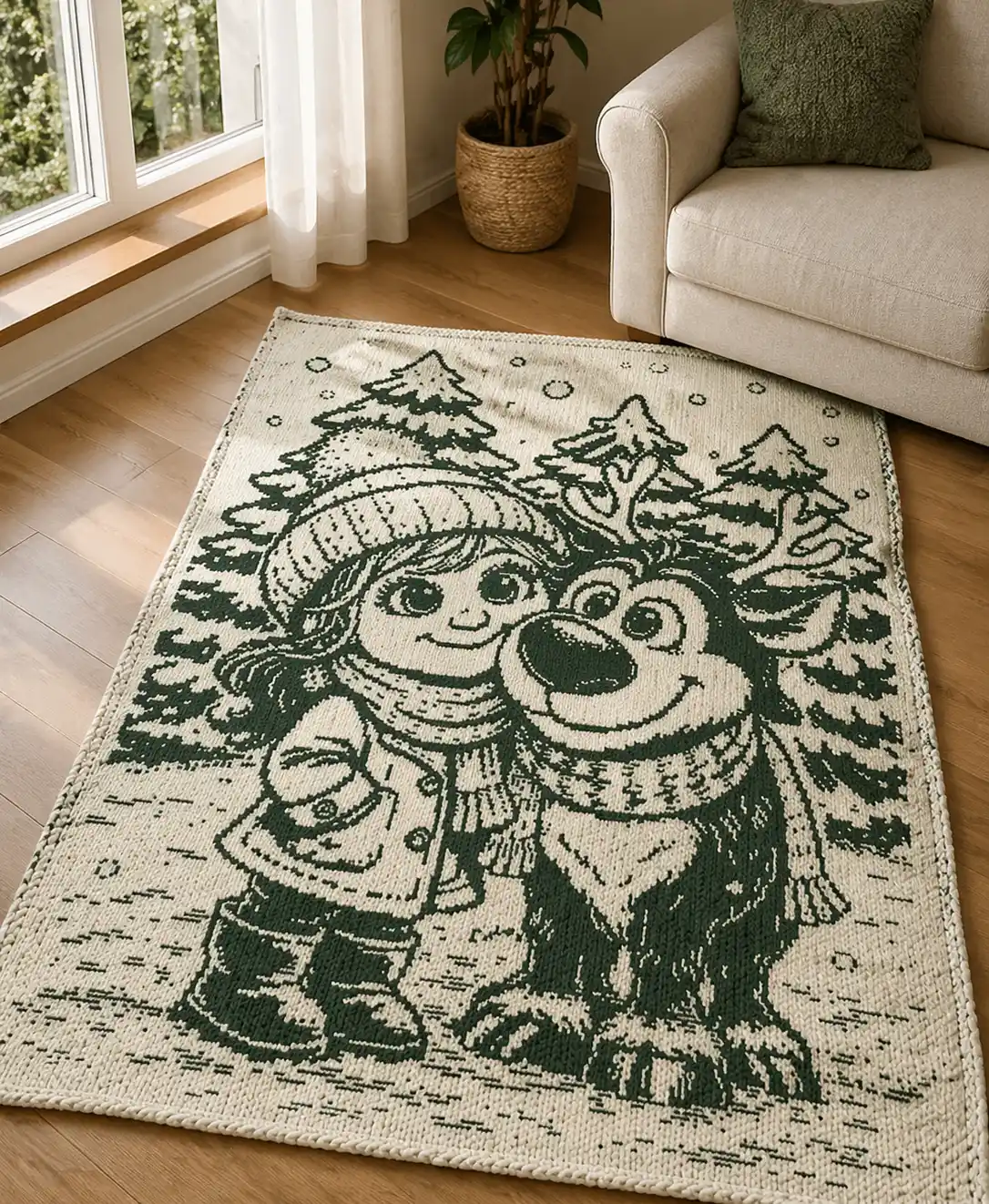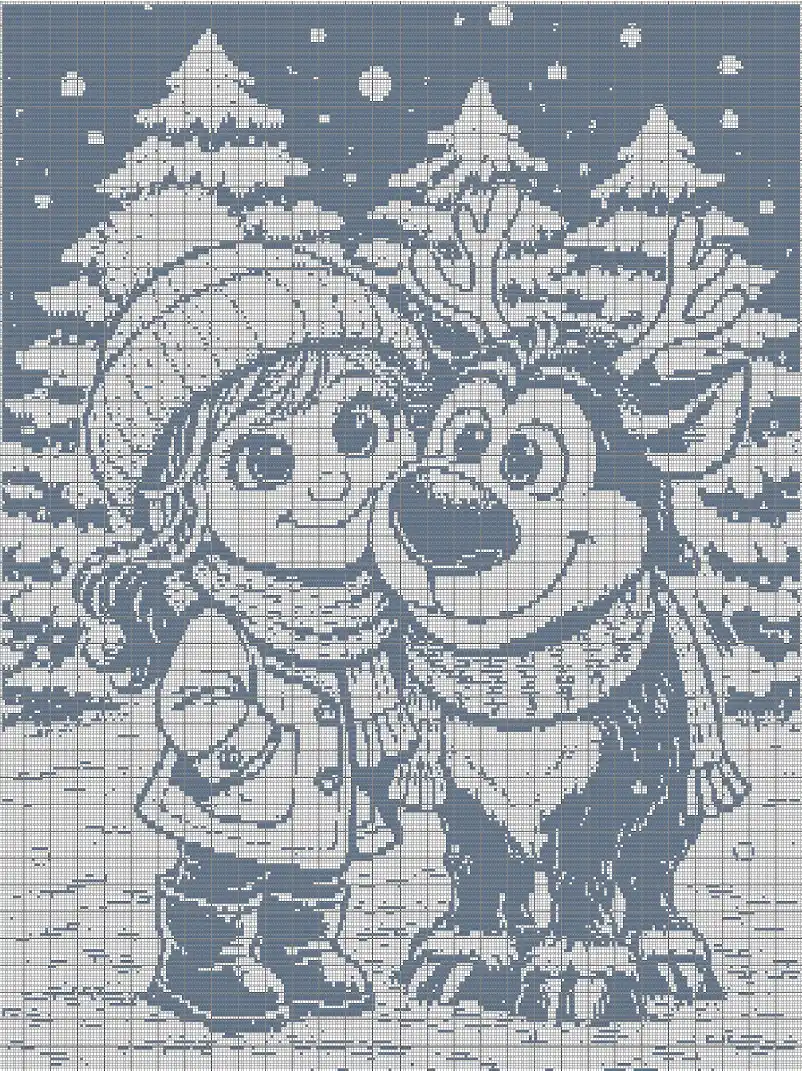 The composition blends expressive characters with playful details and softly textured winter trees, creating depth while maintaining clarity. Bold silhouettes ensure the image reads beautifully from a distance, while finer elements keep the project engaging as you work through each row.