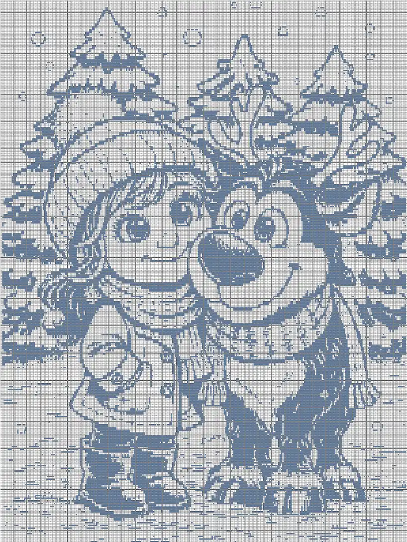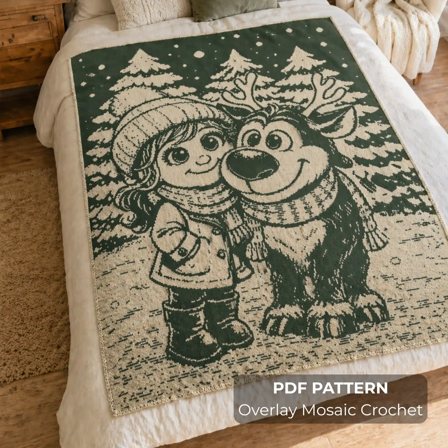 Immerse yourself in a soft winter story with Winter Girl and Reindeer — a large-scale overlay mosaic crochet pattern featuring a gentle scene of a girl and her friendly reindeer companion in a snowy forest. Wrapped in cozy scarves and surrounded by falling snow, the design captures a quiet, heartwarming moment filled with warmth and seasonal charm.